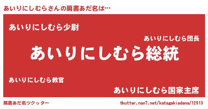 | 意味不明あだ名 | 『自称あいりにしむら』 |