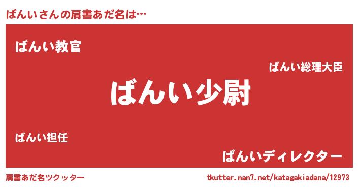 | 男性向けラノベタイトル風あだ名 | 『ばんい~年齢イコール彼女いない歴の魔法使い~』 |