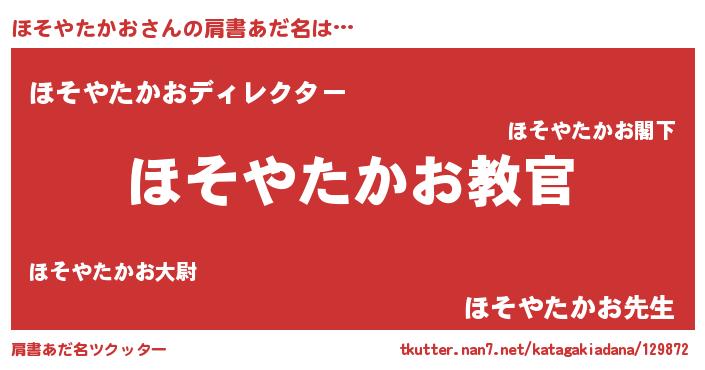 | 女子向けラノベタイトル風あだ名 | 『乙女ゲームの破滅フラグしかない悪役ほそやたかおに転生してしまった…』 |