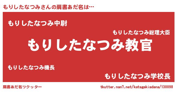 | 女子向けラノベタイトル風あだ名 | 『乙女ゲームの破滅フラグしかない悪役もりしたなつみに転生してしまった…』 |