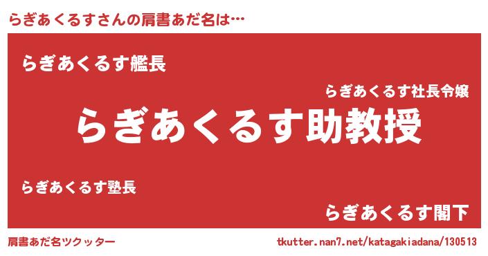 | 男性向けラノベタイトル風あだ名 | 『おまえをオタクにしてやるから、俺をらぎあくるすにしてくれ! 』 |
