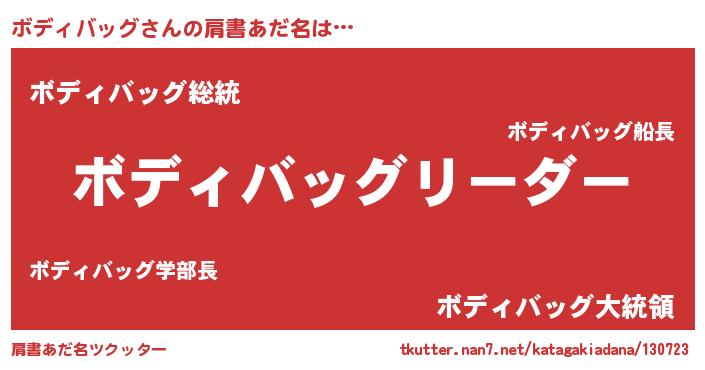 | ヒーロー風カッコイイあだ名 | 『銀牙騎士ボデ』『究極戦士ボディバッグ』 |