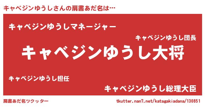 | 男性向けラノベタイトル風あだ名 | 『キャベジンゆうし~年齢イコール彼女いない歴の魔法使い~』 |