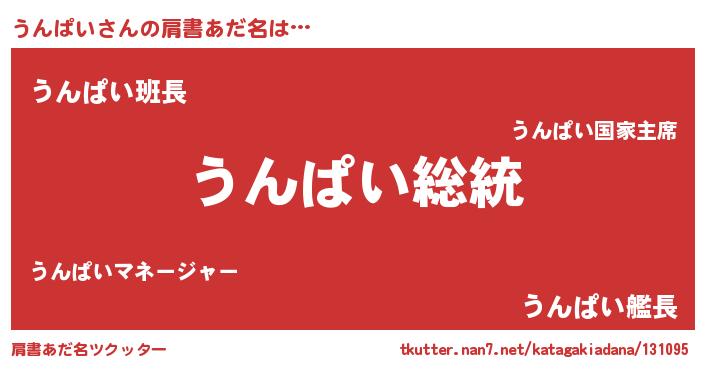 | 男性向けラノベタイトル風あだ名 | 『Re:うんぱいから始める異世界生活』 |