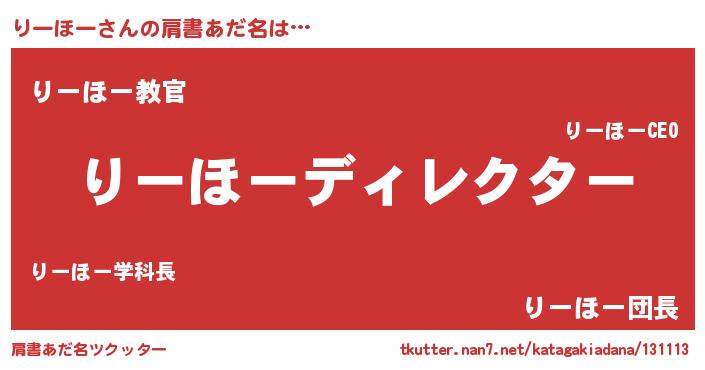 | 男性向けラノベタイトル風あだ名 | 『りーほーに滅ぼされるだけの簡単なお仕事です』 |