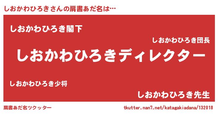 | 男性向けラノベタイトル風あだ名 | 『はたらくしおかわひろきさま!』 |