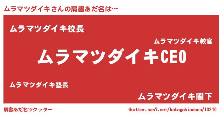 | 男性向けラノベタイトル風あだ名 | 『ムラマツダイキアートオンライン』 |