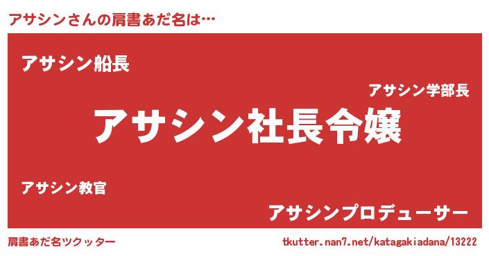 | 男性向けラノベタイトル風あだ名 | 『アサシンアートオンライン』 |