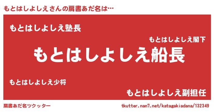 | 男性向けラノベタイトル風あだ名 | 『うちのもとはしよしえが世界を掌握している!』 |