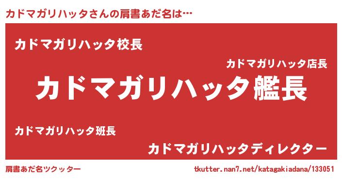 | 男性向けラノベタイトル風あだ名 | 『うちのカドマガリハッタが世界を掌握している!』 |