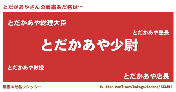 | 男性向けラノベタイトル風あだ名 | 『とだかあや~年齢イコール彼女いない歴の魔法使い~』 |