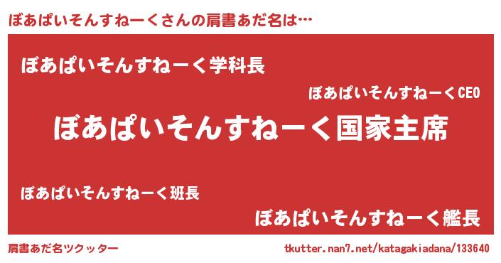 | 意味不明あだ名 | 『ぼあぱいそんすねーくフォーエバー』 |