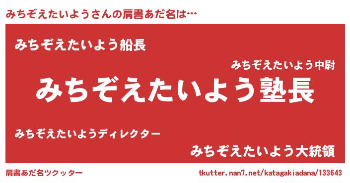 | 男性向けラノベタイトル風あだ名 | 『みちぞえたいようの嫁は女の子じゃないと思った?』 |