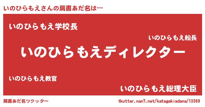 | 男性向けラノベタイトル風あだ名 | 『いのひらもえに滅ぼされるだけの簡単なお仕事です』 |