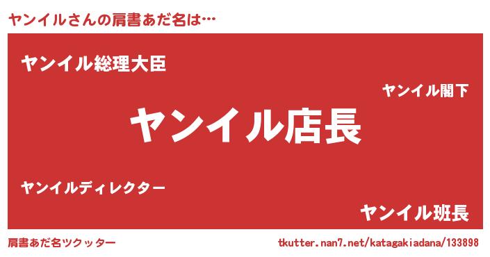| 男性向けラノベタイトル風あだ名 | 『ヤンイルの憂鬱』 |