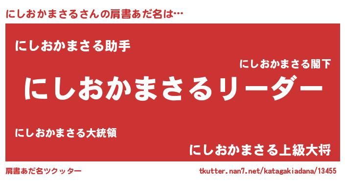 | 男性向けラノベタイトル風あだ名 | 『にしおかまさるの嫁は女の子じゃないと思った?』 |