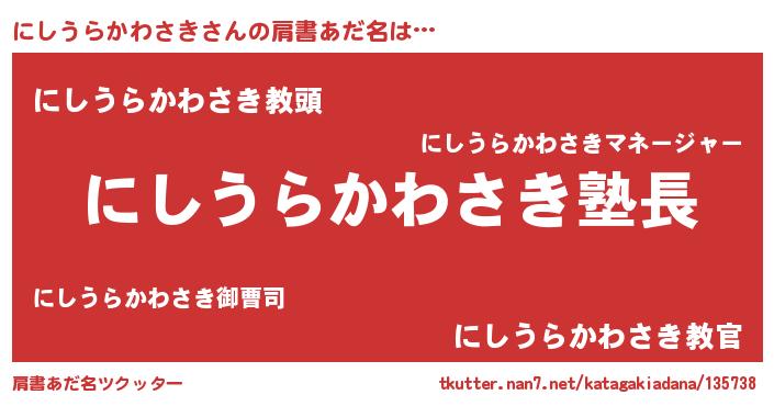 | ポケモン風あだ名 | 『ヒニシウラカワサキ』『ゼニニシ』 |
