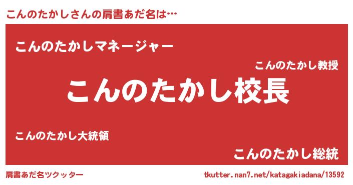 | 男性向けラノベタイトル風あだ名 | 『こんのたかしという概念が存在しない退屈な世界 』 |
