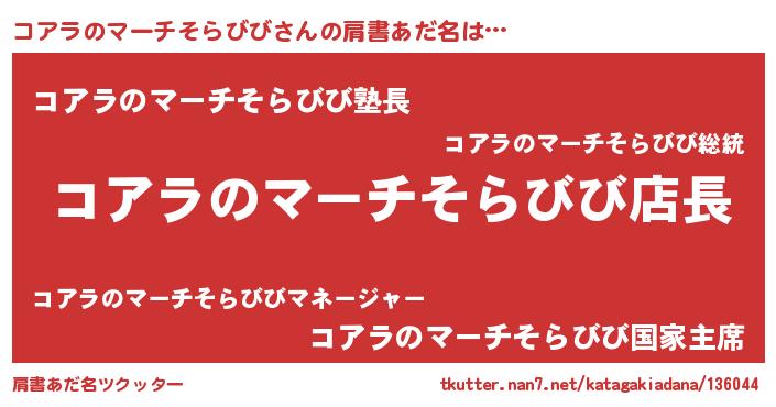 | 男性向けラノベタイトル風あだ名 | 『コアラノマーチソラビビアートオンライン』 |
