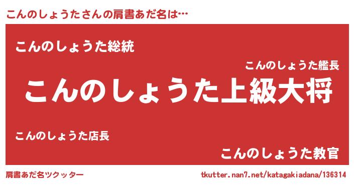 | 女子向けラノベタイトル風あだ名 | 『こんのしょうたの玉の輿計画!』 |