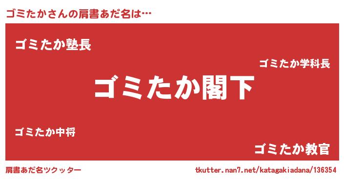| 男性向けラノベタイトル風あだ名 | 『Re:ゴミたかから始める異世界生活』 |