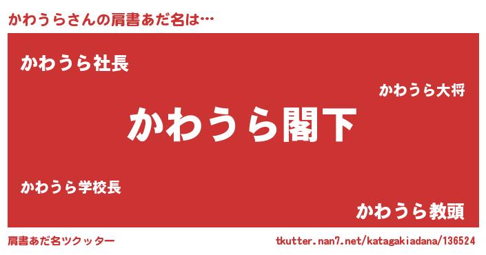 | 男性向けラノベタイトル風あだ名 | 『Re:かわうらから始める異世界生活』 |