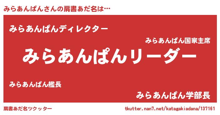 | 女子向けラノベタイトル風あだ名 | 『みらあんぱんは平凡を望む』 |