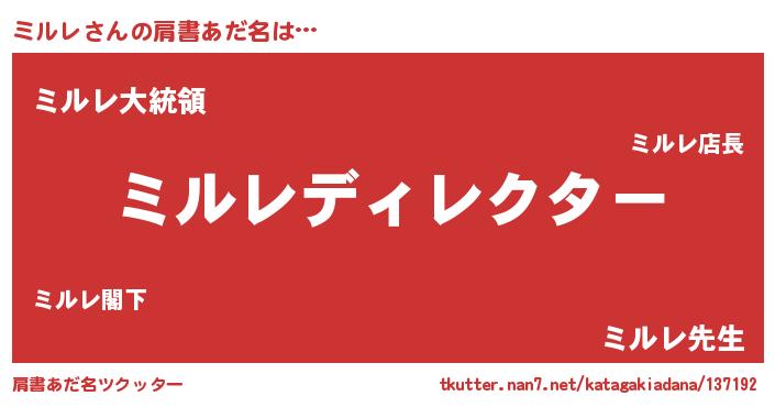 | 男性向けラノベタイトル風あだ名 | 『はたらくミルレさま!』『ミルレの憂鬱』 |