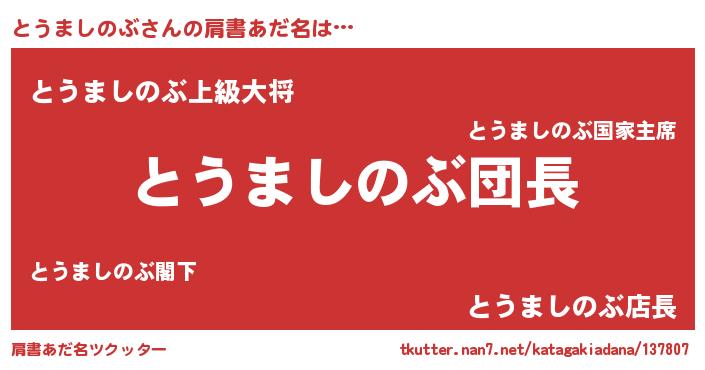 | 胡散臭い通販商品みたいなあだ名 | 『信頼と実績のサプリメント…その名も「とうましのぶ」』 |