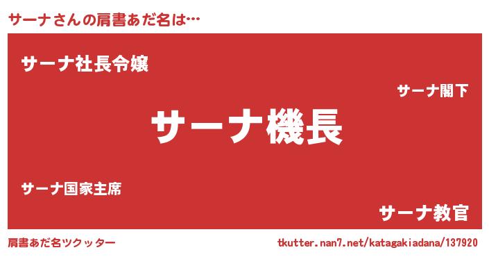 | 男性向けラノベタイトル風あだ名 | 『うちのサーナが世界を掌握している!』 |