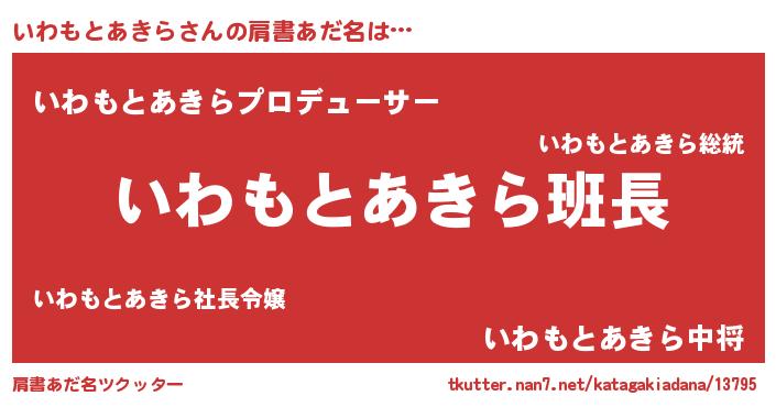 | ポケモン風あだ名 | 『ヒイワモトアキラ』『イワゴンZ』 |