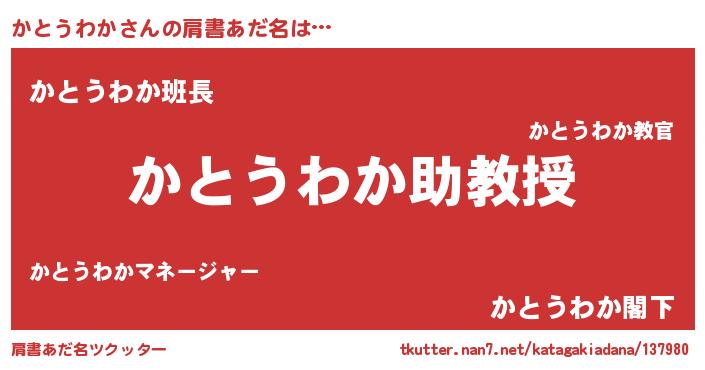 | ヒーロー風カッコイイあだ名 | 『慈愛の使者かとうわか』『銀牙騎士カト』 |