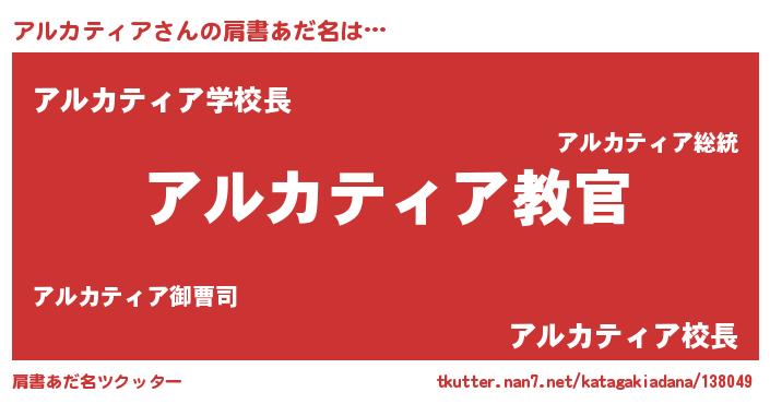 | 男性向けラノベタイトル風あだ名 | 『この素晴らしい世界にアルカティアを!』 |
