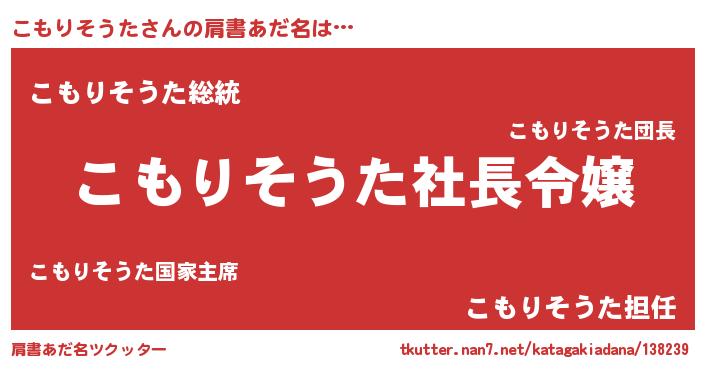 | 男性向けラノベタイトル風あだ名 | 『コモリソウタアートオンライン』 |