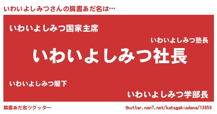 | 男性向けラノベタイトル風あだ名 | 『イワイヨシミツアートオンライン』 |