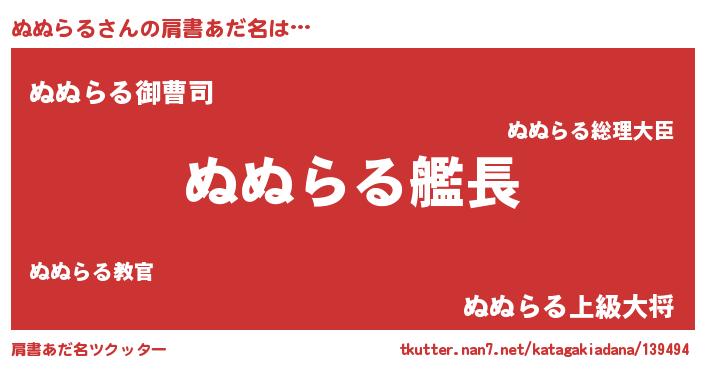 | 男性向けラノベタイトル風あだ名 | 『緋弾のヌヌラル』『魔弾の王とぬぬらる』 |
