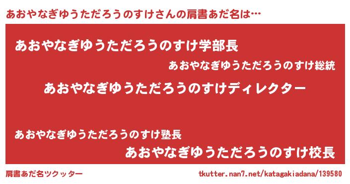 | 男性向けラノベタイトル風あだ名 | 『あおやなぎゆうただろうのすけに滅ぼされるだけの簡単なお仕事です』 |