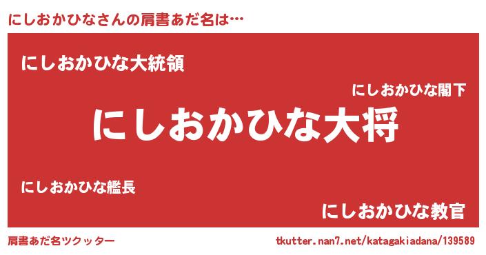 | 男性向けラノベタイトル風あだ名 | 『にしおかひな~年齢イコール彼女いない歴の魔法使い~』 |