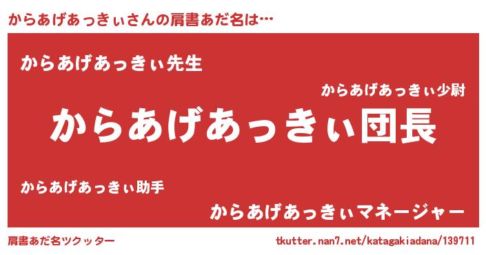 | 男性向けラノベタイトル風あだ名 | 『からあげあっきぃの嫁は女の子じゃないと思った?』 |