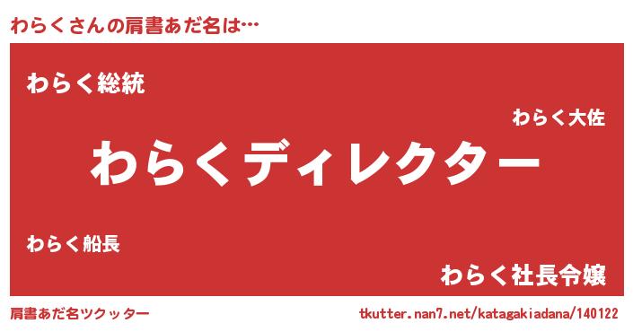 | 男性向けラノベタイトル風あだ名 | 『はたらくわらくさま!』『わらくの憂鬱』 |