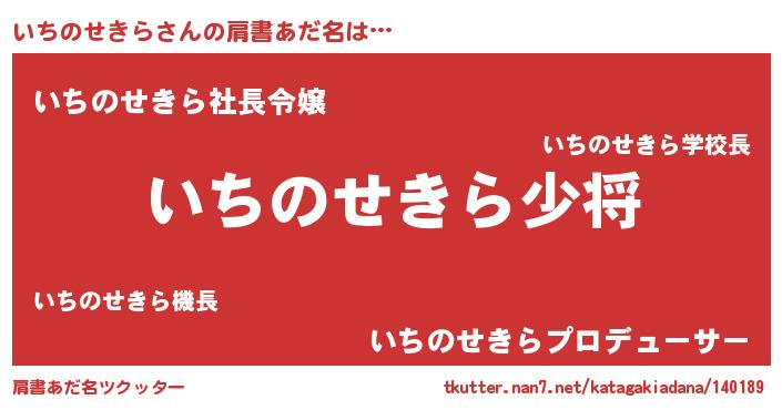 | 男性向けラノベタイトル風あだ名 | 『いちのせきら~年齢イコール彼女いない歴の魔法使い~』 |