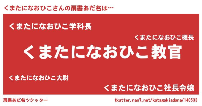 | 男性向けラノベタイトル風あだ名 | 『この素晴らしい世界にくまたになおひこを!』 |