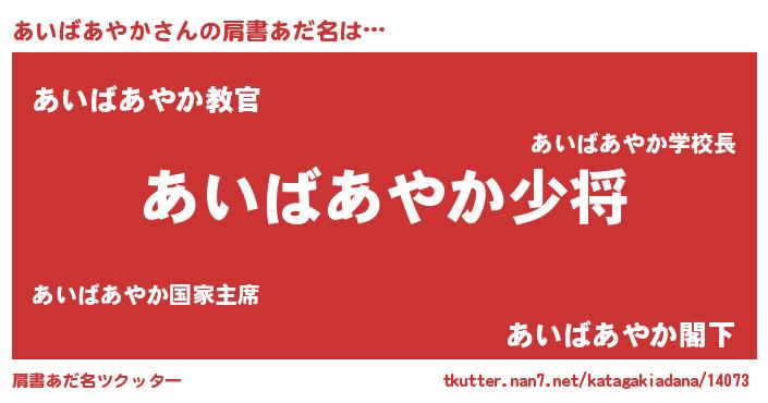| 男性向けラノベタイトル風あだ名 | 『あいばあやか~年齢イコール彼女いない歴の魔法使い~』 |