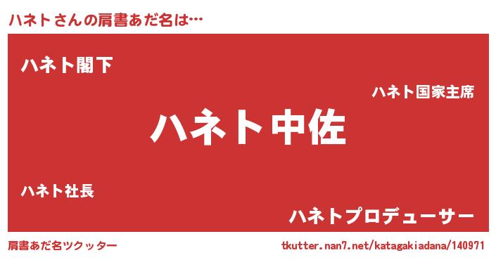 | 男性向けラノベタイトル風あだ名 | 『転生したらハネトだった件』 |