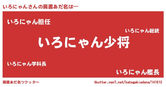 | 男性向けラノベタイトル風あだ名 | 『いろにゃん~年齢イコール彼女いない歴の魔法使い~』 |