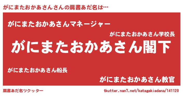 | 意味不明あだ名 | 『自称がにまたおかあさん』 |