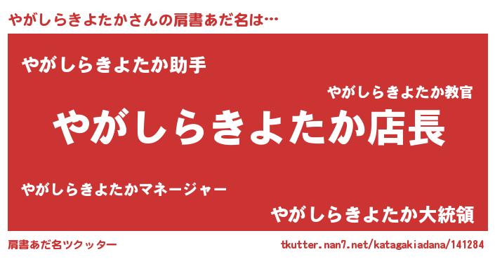 | 男性向けラノベタイトル風あだ名 | 『ヤガシラキヨタカアートオンライン』 |
