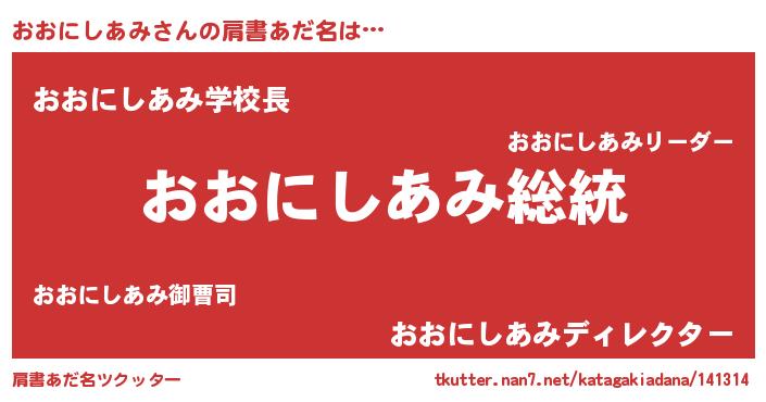 | 男性向けラノベタイトル風あだ名 | 『Re:おおにしあみから始める異世界生活』 |