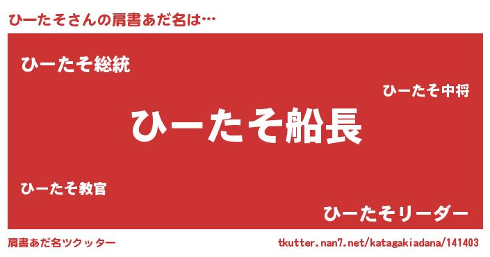 | 男性向けラノベタイトル風あだ名 | 『うちのひーたそが世界を掌握している!』 |