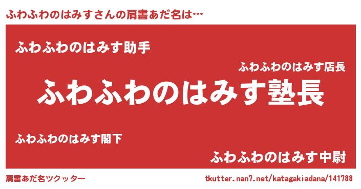 | 女子向けラノベタイトル風あだ名 | 『ふわふわのはみす様がみてる』 |